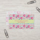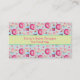 A yummy business card template with a delicious pattern design. Glazed pink doughnuts with sprinkles. Mouth watering cupcakes in pink and blue with rosettes and strawberries on top. Some pastel pink french pastry macarons and little pink candy buttons also decorate this pattern full of sweet treats. A yellow stripe with a green border stretches across the middle of the card so you can enter your business details for easy legible reading. A cute an whimsical design for bakers and bakeries and other food related businesses and professions.