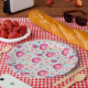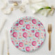 A yummy set of paper plates with a delicious pattern design. Glazed pink doughnuts with sprinkles. Mouth watering cupcakes in pink and blue with rosettes and strawberries on top. Some pastel pink french pastry macarons and little pink candy buttons also decorate this pattern full of sweet treats.