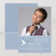A blue panel with a dotted top border hods a white dove with a sprig of leaves in his beak. An invitation that's perfect for any religious celebration. Just add your favourite photo.