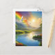 An image of a dove flying over a serene landscape with a rainbow in the sky.