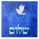 Features "shalom" (Hebrew "peace") and a dove carrying a bit of olive branch in its beak on a nice blue and white fractal background featuring a Star of David and the suggestion of bird wings.