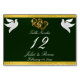 This design features an elegant emerald green background with ribbon borders, linked hearts & doves with a place for the table number, couple's names and date of event. Available in several wedding theme colours. (Ribbon is simulated in the artwork). Designed to coordinate with the "Two Shall Become One - Silver & Gold" Wedding Collection. To change details, click «Personalise». To move the text or change the text size, font, or colour click «Click to customise further».