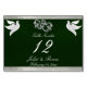 This romantic design features an elegant emerald green background with ribbon borders, linked hearts & doves with a place for the table number, couple's names and date of event. Available in several colours for your wedding theme. (Ribbon is simulated in the artwork). Designed to coordinate with the "Two Shall Become One - Silver & Gold" Wedding Collection. To change details, click «Personalise». To move the text or change the text size, font, or colour click «Click to customise further».