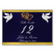 This design features an elegant navy blue background with ribbon borders, linked hearts & doves with a place for the table number, couple's names and date of event. Available in several wedding theme colours. (Ribbon is simulated in the artwork). Designed to coordinate with the "Two Shall Become One - Silver & Gold" Wedding Collection. To change details, click «Personalise». To move the text or change the text size, font, or colour click «Click to customise further».