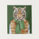 This design features a tiger winter ready wearing his down vest, green knit scarf and Christmas sweater.