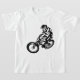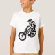 A rider on a downhill MTB bike. I have drawn this using white space and black. The rider is kitted out in helmet and padded gear.