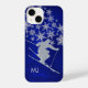 Here's the perfect phone case for anyone who loves to downhill ski! It features a silver grey snow skier with a cascade of pretty silver snowflakes around him. At the bottom left is your monogram, also in silver. The image and text are placed on a vivid royal blue gradient background.