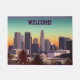 This colourful vector illustration features a gorgeous skyline dominated by skyscrapers and palm trees from downtown Los Angeles with a beautiful Californian sunset in the background.