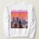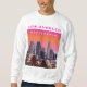 Colourful vector illustration featuring a gorgeous skyline dominated by skyscrapers and palm trees from downtown Los Angeles with a beautiful Californian sunset in the background.