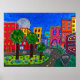 A Folk Art view of Downtown in the modern city. Fantasy-bright stores and black-toppy streets grace the cityscape beneath a starry sky and a full moon rising. Imaginary Urban elements with a touch of nature and trees.