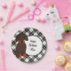 Brown Dachshund puppy, black and white chequered background and centre customisable text.