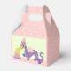 Cute dragon themed birthday party favours featuring funny pink and purple fire-breathing dragon lighting the candles on the cake.