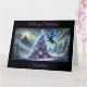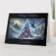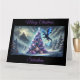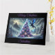 A dreamy Christmas scene with a majestic fantasy dragon admiring a beautiful Christmas tree in a magical winter wonderland.