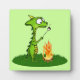 Cute little cartoon dragon with big googly eyes and a yellow horn toasting a marshmallow over a camp fire. Original digital cartoon art by Taylor Addams.