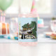 A cute green little dragon sleeping on books with his teddy bear, candle, feather pen and reading glasses in a backdrop of blue