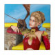 3D digital render of a beautiful Dragon Lady with a little Dragon on her arm on a fairytale castle and a blue sky background