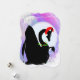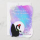A bright and colourful background design with the black silhouette of a Christmas dragon wearing a Christmas hat and a holly wreath. A beautiful holiday card for the dragon lover in your life.