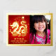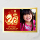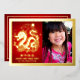 “Happy New Year” real gold foil typography in both Chinese and English, a stunning visual of a graphic real gold foil dragon, clouds and stars, your names, and the photo of your choice overlay a traditional Asian red circle pattern and real gold foil border on the front. On the back, a cloud and star visual, along with your personal message, overlay another traditional Asian red circle pattern background. Feel the warmth and joy of the holiday season whenever you send this stylish yet modern, personalised 2024 Chinese Lunar New Year of the Dragon photo real gold foil greeting card. Make sure someone special receives this greeting!