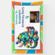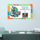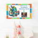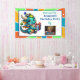 Blue, green, yellow and orange dragon themed boy's birthday party personalised photo banner. Cute for any little boy who loves dragons! Cute cartoon dragons in birthday hats holding birthday cakes.