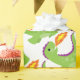 A cute little green dragon with hearts on its back is shooting flames out of his mouth.