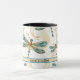 Cute and whimsical dragonflies in flight on a customisable coffee mug. Dragonflies have detailed wings and cute smiling eyes in aqua and gold patterned design on this two-toned mug you can personalise for Mum, Dad or birthdays.