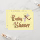 The dragonfly baby shower invitation features a whimsical and playful theme. The design of a pale yellow background with the words "Baby Shower" in a fun flowery font and a cute pink and brown dragonfly is pictured on the front. The backside of the invite carries the same pale yellow background with a personalised wording template. Use the wording template to insert all your own text.