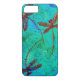 Gorgeous multicolored dragonflies dance on a mottled turquoise background.