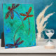 Gorgeous red, blue and green coloured dragonflies dance on a mottled turquoise background. From my original dragonfly artwork.
