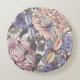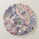 This lovely pink, grey, and lavender purple round pillow features a lovely floral and dragonfly pattern. The subtle colours and swirling botanical patterns are reminiscent of vintage textile designers from the 1800s, such as William Morris, or else French farmhouse florals. This lovely pastel pillow would add retro panache to many styles of decor or else make a thoughtful gift.