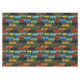 A wing group of dragons in the colours of black, brown, red, orange, yellow, blue, and green fly open wings across a deep dark green backdrop soaring upwards. The dragons are drawn in a tribal tattoo style.