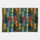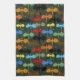 A wing group of dragons in the colours of black, brown, red, orange, yellow, blue, and green fly open wings across a deep dark green backdrop soaring upwards. The dragons are drawn in a tribal tattoo style.