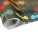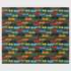 A wing group of dragons in the colours of black, brown, red, orange, yellow, blue, and green fly open wings across a deep dark green backdrop soaring upwards. The dragons are drawn in a tribal tattoo style.