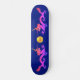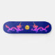 Dragons in pink, red and blue shades playing with a golden ball on indigo blue Skateboard.