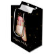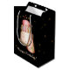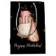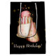 This is an elegant birthday gift bag for her, with a bright patterned pink, gold and white birthday cake and striped birthday hat on a dramatic black background. The background is filled with gold stars, and the cake and hat each have star decorations at the top. The white text at the bottom may be customised. Both sides of the bag have the same image. *Clip art used in this design is copyrighted by Encore Software, Inc., which permits use to its licensors. All rights reserved.