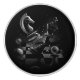 features a visually striking representation of a chess scene depicted in black and white. The primary focus is on the intense moment when the knight piece (commonly referred to as a horse) captures or defeats the king piece, resulting in a dramatic outcome. The king piece is shown breaking apart, symbolising its defeat and adding a dynamic element to the design. The artwork is rendered using a monochrome colour scheme, meaning it utilises only black and white shades, providing a strong contrast and emphasizing the visual impact. The absence of colour enhances the dramatic effect by emphasizing the play between light and shadow. The design shows the chessboard with some surrounding space. The horse as the central element is positioned in a dynamic stance and captivates the viewer's attention. It might be depicted in the midst of action, with its head held high and one or both hooves raised in a conspicuous manner. This captures the essence of the knight's unique L-shaped movement pattern in chess. Overall, the design creates a powerful and visually appealing depiction of a critical moment in a chess game, where the horse piece dominates the scene by defeating the king piece. The monochrome colouring and the dramatic depiction of the broken king further increase the emotional intensity of the work of art.