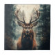 A powerful and dramatic scene of an elk standing proudly in the woods, its majestic antlers towering above the dense forest. The deep shadows and misty atmosphere around the elk create a sense of mystery and strength, capturing the raw beauty of nature.
