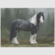 A beautiful grey and white draught horse standing in front of a misty forest.