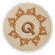 Initial that is surrounded by a circle of leaves created from an image of an angled "wrought iron" bracket replicated 8 times, with branches forming a central octagon. Image is shades of brown, Letter has a drop shadow. Background is beige.
