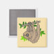 A cute drawing of a brown sloth clinging to a branch with leaves, hanging upside down.