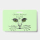 This name or identification badge is light green on the front and back with a black drawing of a pretty cat face with whiskers and bright green eyes. Customise your name and information with the templates.