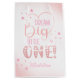 Birthday gift bag features pink glitter, starry dream big little one with hearts typography/customisable name, and a cute sleepy brown bear wearing a crown sitting on a cloud.