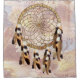 A dream-catcher design with a gold & brown trimmings that includes a round bamboo circle web of life with brown tones feathers and red beads on a soft feather background.