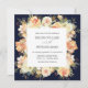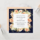 An elegant, modern floral wedding invitation with a square frame of watercolor roses and peonies and foliages in blush pink and peach over an elegant navy blue background.