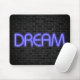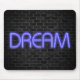 Illuminated urban brick wall with DREAM text in glowing purple neon lights.