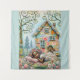 A young girl with colourful flowers in her hair is peacefully sleeping in front of a whimsical house made of various colourful paper scraps. Swirling trees and blooming flowers surround the scene, creating a dreamlike atmosphere. Digital Art