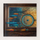 AI art depicting a dream catcher in a window outlooking beautiful Fall trees. Blue and orange beads and feathers.