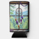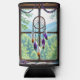 Boho can cooler. A rustic wood window with a white, orange and purple feathered dreamcatcher hanging in the window along with a string of colourful crystals. The window overlooks a beautiful scene of forest and mountains.