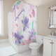 A designer curtain with a large floral print with a watercolor design. Purple, pinks, reds