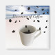 It's raining down coffee beans, yes, I'm dreaming of coffee. A blue sunset sky with pink overtones. Coffee beans and a white mug of coffee.