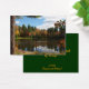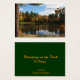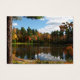 This lovely Artist Trading Card features a young woman sitting and dreaming on the dock at the edge of a large pond. Autumn is in the air. The water is surrounded with trees in gorgeous fall foliage colours of yellow, green, red, orange and gold. The blue sky has fluffy white clouds and all this is reflected in the water. The trunk of a large pine tree defines the left side. The brilliant sunshine is reflected in her red hair.